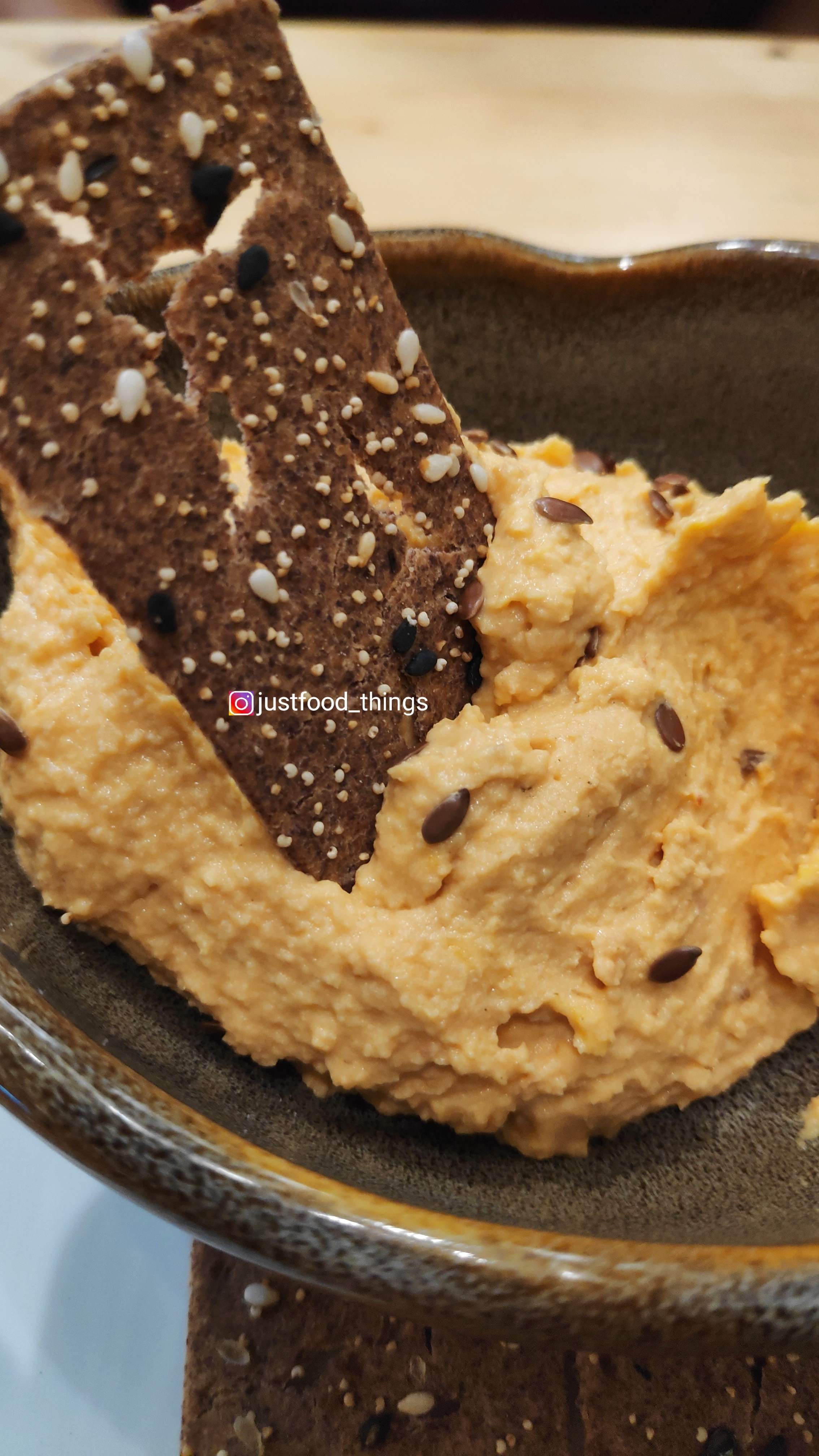 In the picture we have Ragi Crackers with sun-dried tomato hummus.