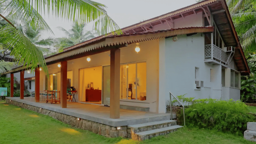 The villa's got a quaint vibe and evokes the serenity and peace of simpler times. The villa with a tiled roof and veranda comes with a beautiful garden with pretty lawns and coconut palms that you can unwind after on a lazy sunny afternoon - think cozy deck chairs to lounge on. The property is geared to accommodate 8 guests at a time, though at a maximum they can take 10. You can play carrom, badminton, read from their book collection or even binge-watch your favourite shows.