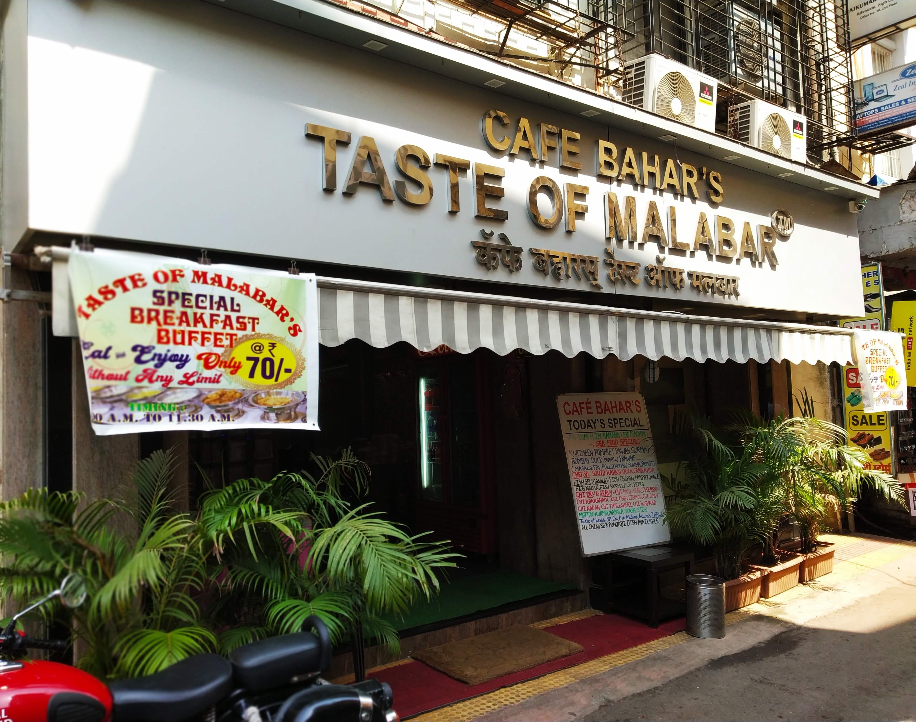 Cafe Bahar's-Taste of Malabar serves the best of authentic Kerala cuisine. It doesn't boast fancy interiors serves simple food on a banana leaf and is nestled in a lane at Fort. The must-have items on their menu are the Chicken Nadan Curry, Appams, Porottas, and Payasam.