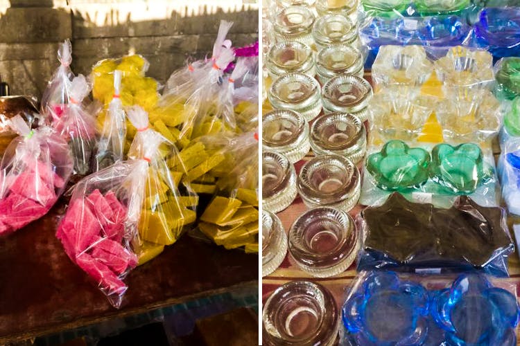 Get your hands on colourful candles {INR 10}, candle stands made of glass and metal {INR 50 upwards}, and some super delicious food. We loved the snacks- traditional ones such as shankar pali, chakli, laddo, fryums {INR 20 upwards}, Goan and East Indian food masalas {INR 160 per pack} and the best of the lot – Goan sausages {INR 350 for 100 pieces}.