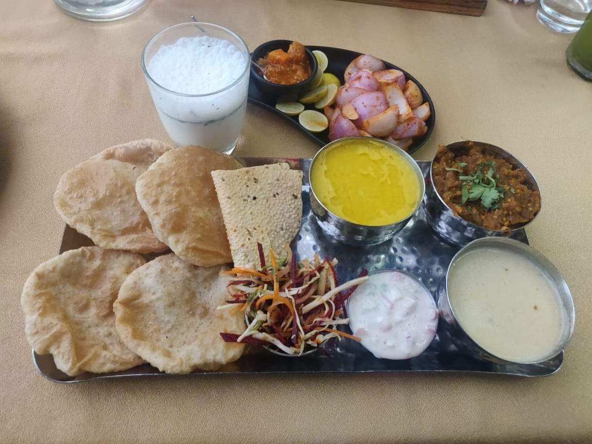 - 4 Puris, Baigan ka bharta, Masal Khichdi, Kadhi, Raitu, Roasted papad, Salad, Masala chaas