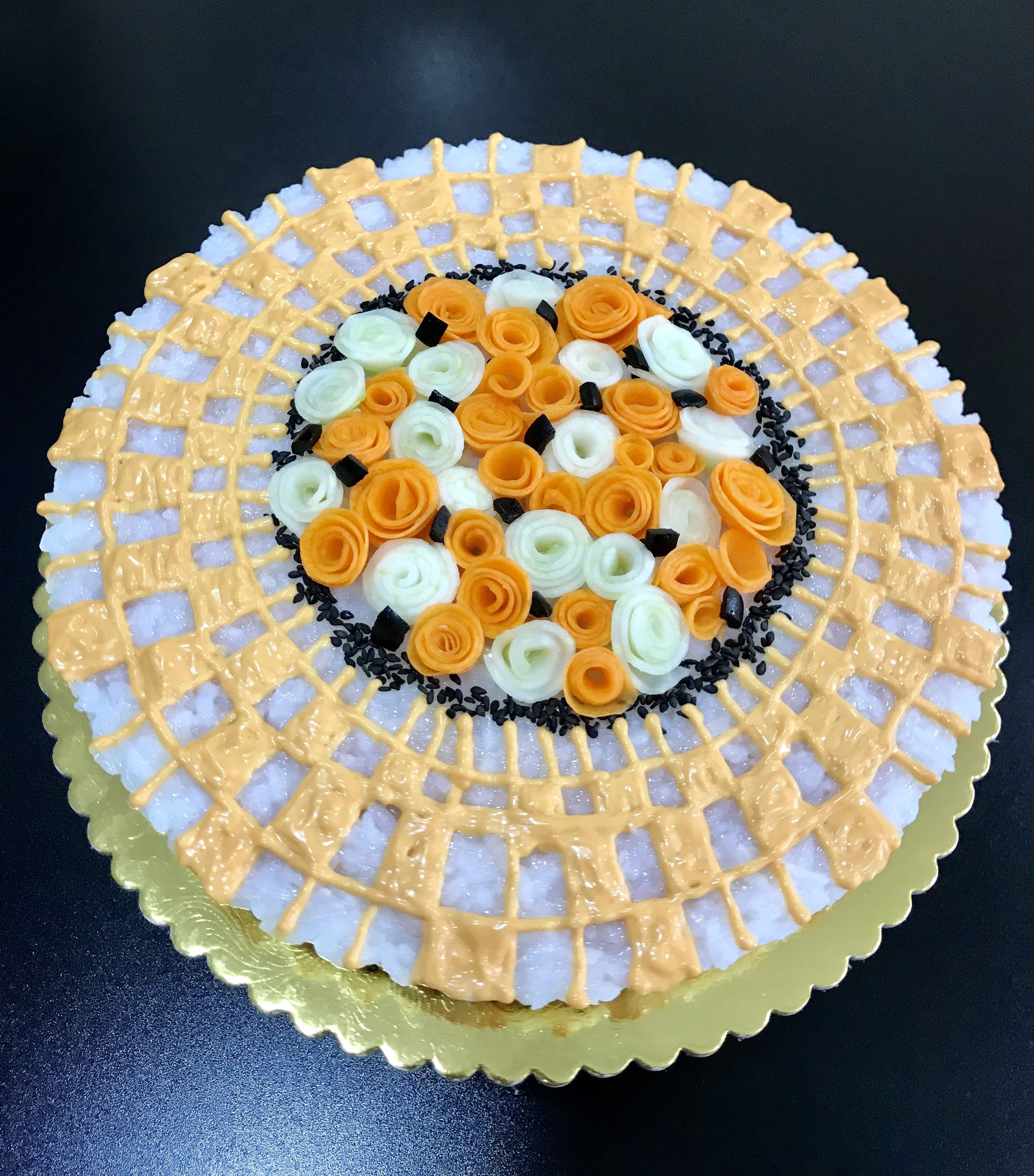 So, let’s get into the details now. There are around 10-12 variants in her vegetarian sushi cakes and around 6 variants in her Jain sushi cakes. We tried her avocado, asparagus, edamame seeds with cream cheese sushi cake which was decorated beautifully and came with a side of wasabi for that extra kick and some soy sauce. Each layer stands out, with different flavours popping in the mouth and making for a mouth-watering end result.Â