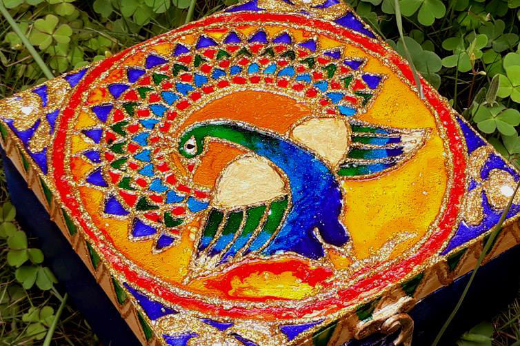 What's Happening: Learn to make a draw a beautiful peacock with acrylic liners and fill up the spaces with stain glass colours to give a reflecting glass effect on a wooden box. Made with metallic primers, and metallic/sparkling liners to give it a metal finish look, you can use the box to keep your jewellery, small valuables or simply use as a decor piece.