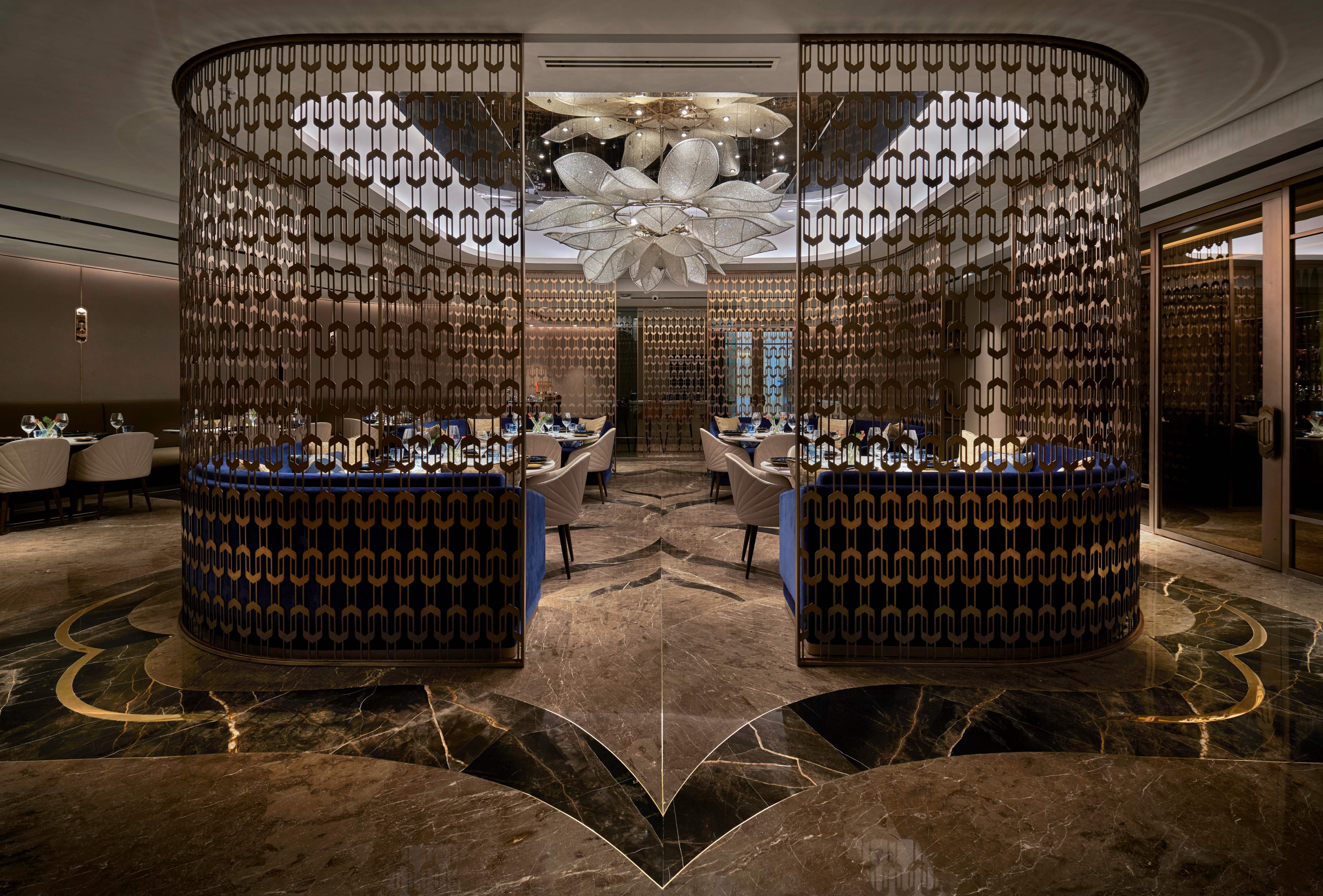 Ummrao is designed in a palette of warm colours that balances the glamorous elements perfectly. The botanical motifs on the handcrafted enamelled artwork beautifully ties in with the freshness of the menu that Ummrao offers. Lighting was an integral part of the design strategy and offers a moody and dramatic ambience which is punctuated with accents of decorative lighting. Perhaps the most elegant detail of the restaurant is the glowing lotus chandelier that acts as the perfect finishing touches while the gem cut mirrors on the wall provide an edge to the traditionally designed space.