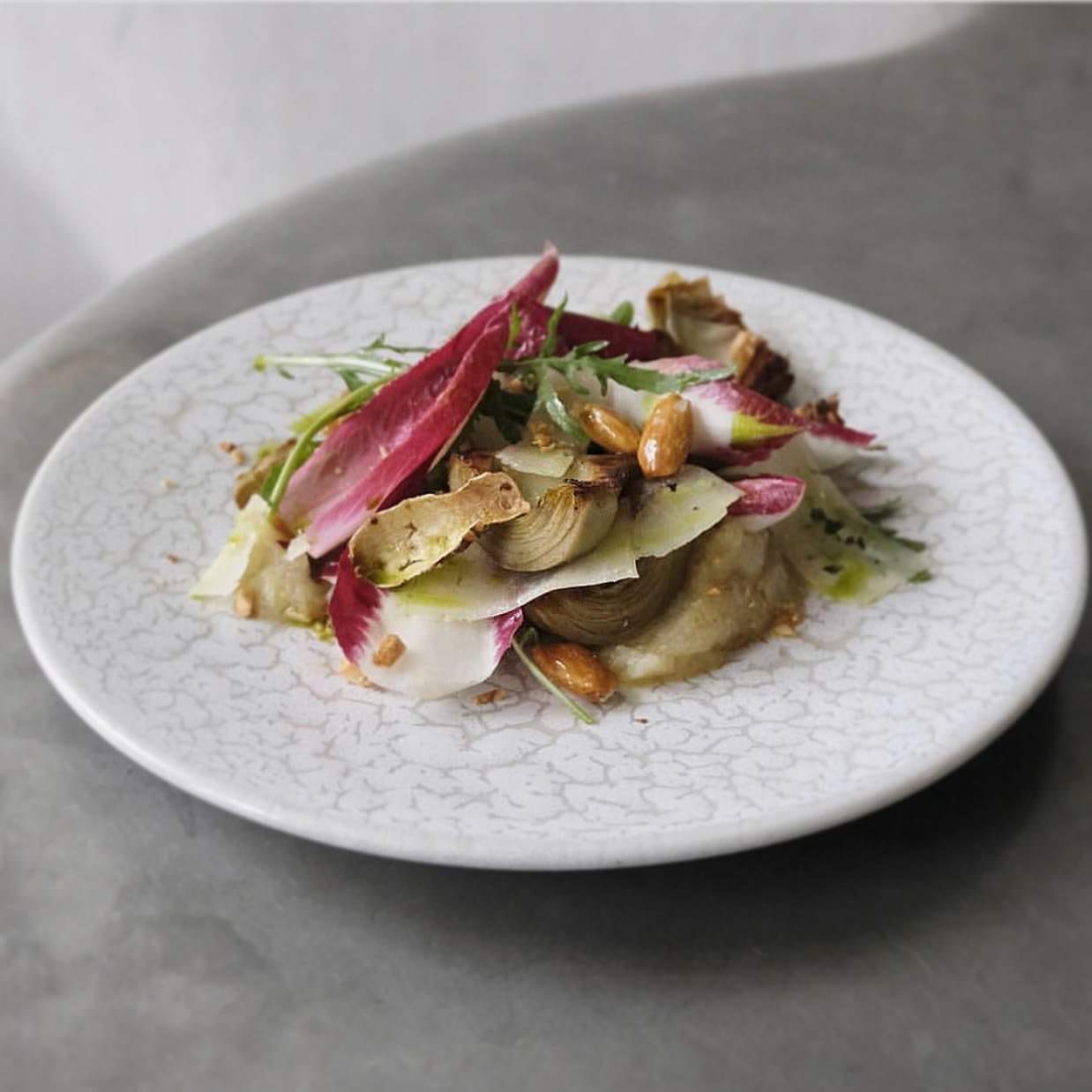 -Pickled Violet Artichoke, Rocket, Endive, Candied almonds, Rocket Flowers