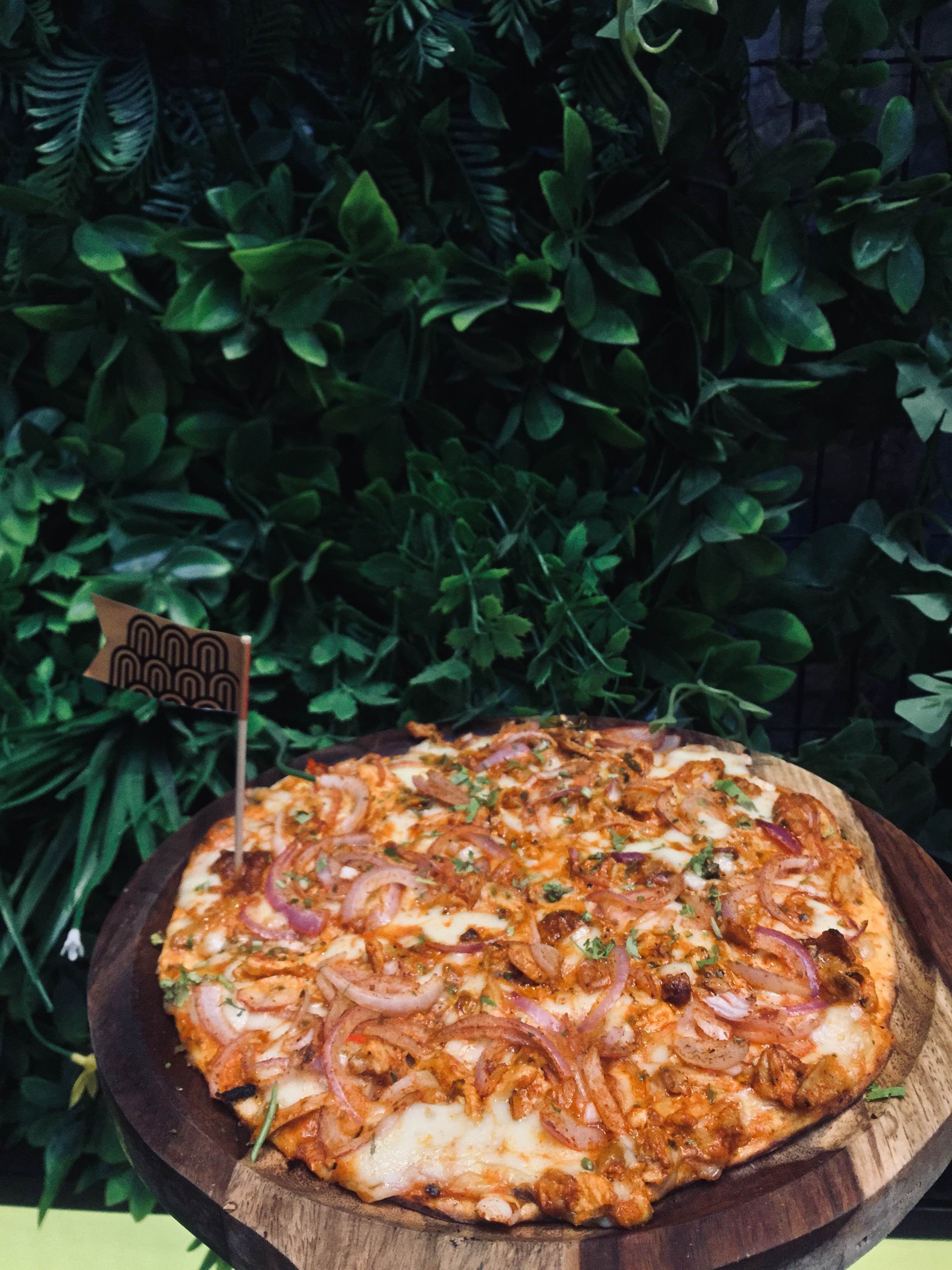 3) Tandoori Bhuna Murgh Pizza: Tandoori chicken pizza with mozzarella and makhni sauce. Great taste, decent quantity. Recommended!