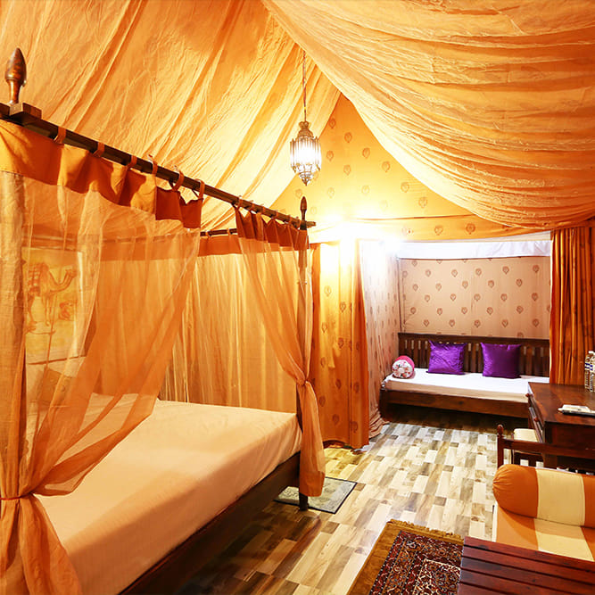 One of the best things about Vedi Farm is that it offers six different kind of rooms across budget range of INR 3,800 to INR 7,500 per room per night. Our favourite, however, is the luxury tent room with romantic poster beds, antique furniture and spectacular mountain views.