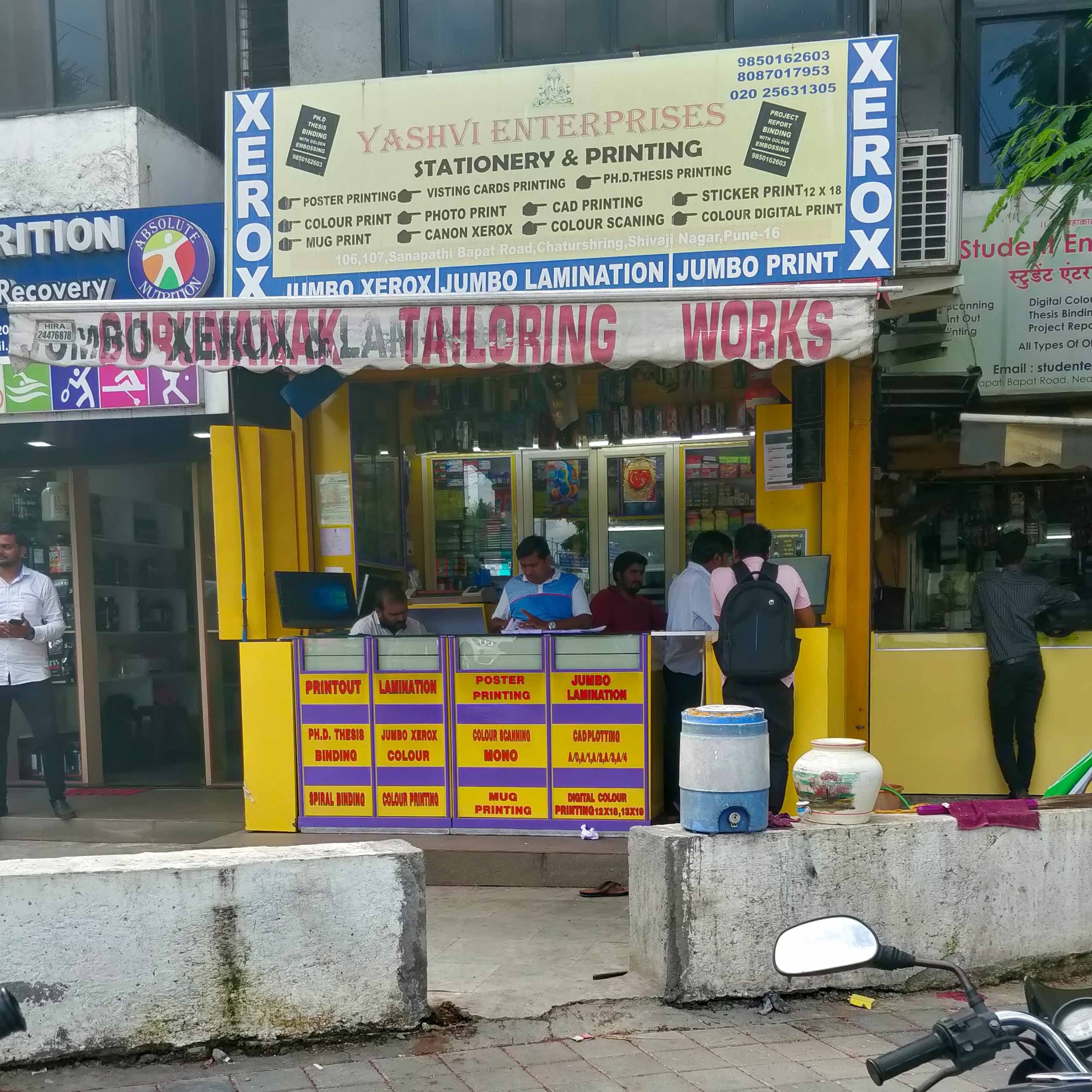 Located at the beginning of S.B. Road, you will find Yashvi Enterprises. The store majorly does printing work and you can get your thesis book done over here. They also do xeroxes, scanning, binding and much more. Along with that the store also has basic stationery such as pens, pencils, notebooks, etc.